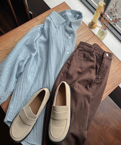 Mokan条纹细褶牛仔色松紧带宽裤 (短/基本/长款ver)